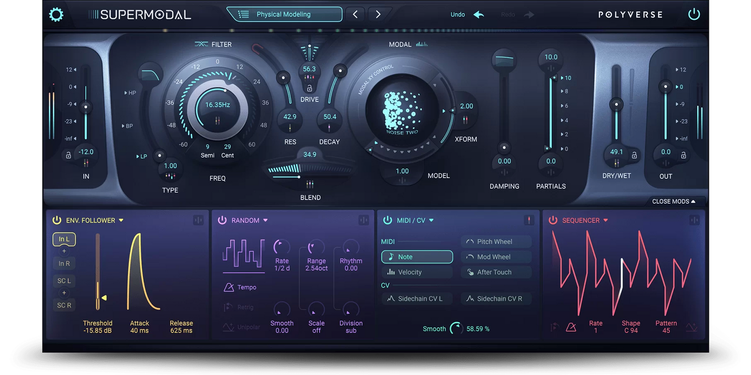Supermodal on voimakas ja ainutlaatuinen suodatin, jolla on vertaansa vailla olevat äänenmuotoilumahdollisuudet, jotka saavat musiikkisi resonoimaan. Se muokkaa tavallisia kappaleita hyödyntäen voimakasta Modal-suodatinta, joka jäljittelee ääniominaisuuksia, jotka on mallinnettu laajasta resonanssikehojen valikoimasta. Yhdistettynä rinnakkaiseen state-variable-suodattimeen ja laajaan modulaatiojärjestelmään, yksi äänisignaali voidaan manipuloida laajaksi taajuusalueeksi luoden säihkeitä elokuvamaisia äänimaisemia, sykkiviä rytmejä, harmonista liikettä sisältäviä pad-ääniä tai mitä tahansa muuta voit kuvitella.