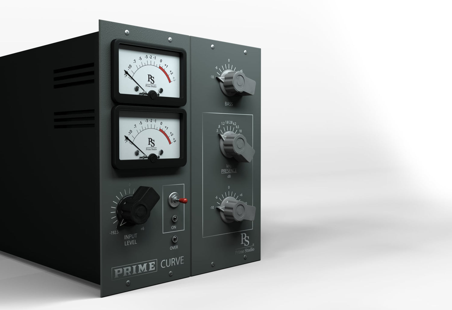 To complete the console channel, used in combination with Prime Studio® Prime Mix and Prime Studio® Compressor, Curve offers additional bass and presence frequencies of musical sounding 500, 800, 1.200, 1.800, 2.800, 4.200, 6.500 and 10.000 Hz alongside harmonic preamp distortion being set with the input level knob. Always stay in control of your signal levels using the VU style input and output meters.