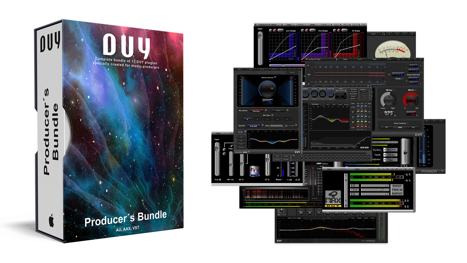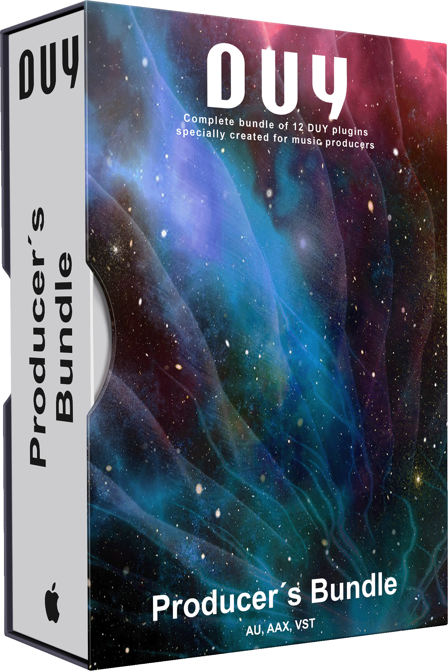 The DUY Producer's Bundle a collection of exceptional high-quality plug-ins designed for 64-bit AAX, Audio Units, and VST formats. This comprehensive bundle comprises 12 remarkable plug-ins that are guaranteed to elevate your audio production to new heights. It contains 12 amazing high-quality plug-ins: LucidVerb, Dream Dynamics, Monster MIX, POWER, Analog BUS, DUY DaD Tape, DUY DaD Valve, DUY Deep Analog EQ, DUY Wide, DUY Silence, MAX DUY and DUY Shape.