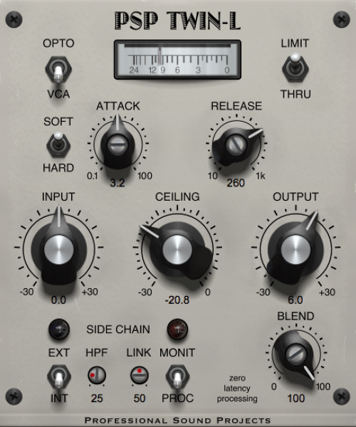 PSP Twin-L on kaksinkertainen algoritmi klassinen limiter-efekti. Tämän plug-inin tavoitteena on tarjota laaja valikoima muokkausvaihtoehtoja. PSP Twin-L pystyy jäljittelemään kahden tyyppisen limiterin pääominaisuuksia: VCA-limiterit, jotka ovat moderni analoginen limiterityyppi, ja Opto-limiterit, jotka ovat vintage-optisia limitereitä.