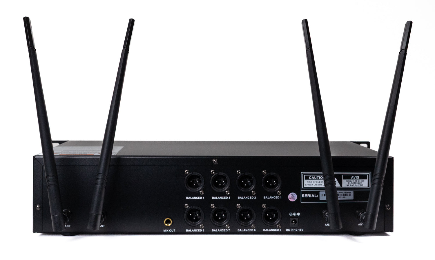 - Consists of 8 tabletop microphone transmitters and a single receiver.