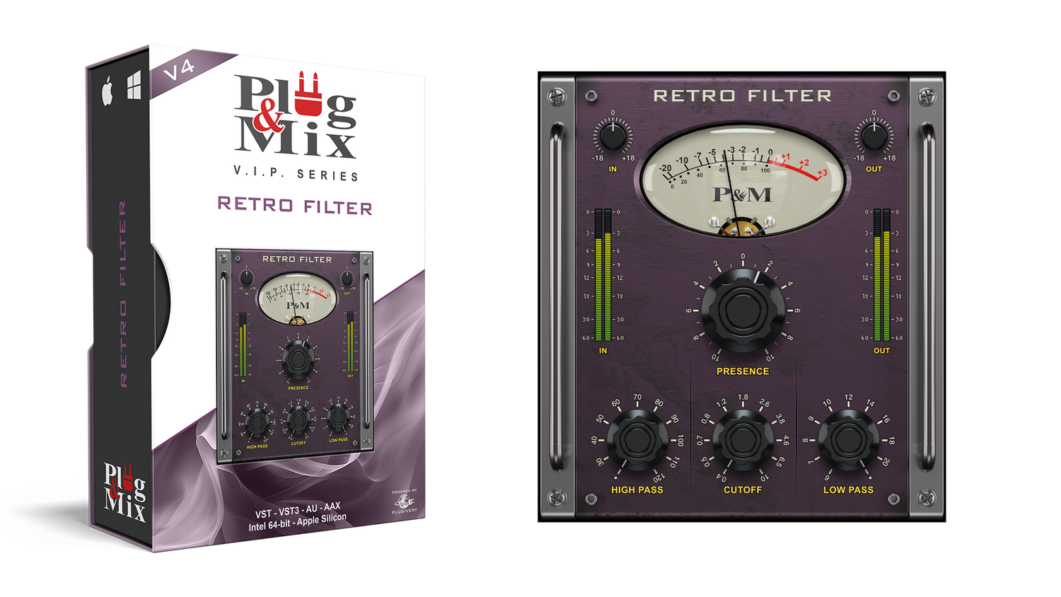Tuo ääneesi vintage-suotimen lämpöä Retro Filterillä – pluginilla, joka tarjoaa Low-Pass-, Band-Pass- ja High-Pass-tilat. Presence-, High Pass- ja Low Pass -säätimillä Retro Filter mahdollistaa kitaroiden, laulun, basson tai minkä tahansa analogityylistä suodatusta kaipaavan trackin tonaalisen profiilin tarkan muotoilun.