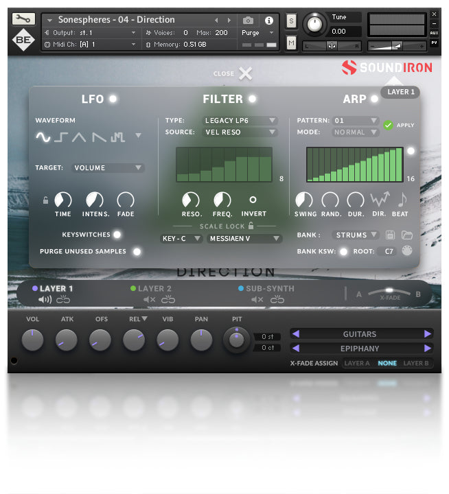 Tämä kirjasto tulee mukautettavan LFO-järjestelmän kanssa, jossa on valittava LFO-muoto, modulaatiotavoiteparametri, nopeus, intensiivisyys, tempo-synkronointi ja fade-in-aika. Voit myös käyttää valintasi mukaan 12 matala- ja ylipäästösuodattimia sekä FX-suodattimia, joissa on määritettävät modulaatiotavoitteet, kuten nopeus, modulaatiopyörä, ilmaiseminen, jälkikontakti, näppäinasema ja askelsekvensseritaulukontrolli. Mukautettava arpeggiaattorimme tarjoaa nopeustaulukon ja hallintaa arp-suunnasta, ajoituksesta, swingistä, satunnaistamisesta ja kestosta. Olemme lisänneet avaimen ja asteikon lukitusjärjestelmän, joka rajoittaa nuottejasi yleisiin asteikkoihin ja avaimiin helppoa melodista säveltämistä ja live-esitystä varten.