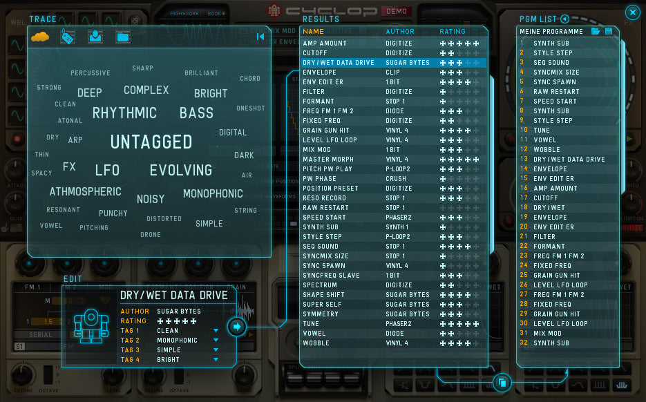 Monofoninen, raaka ja uskomattoman monipuolinen. Cyclop on täynnä työkaluja tulevaisuuden bassolle ja sen yli. Wobble Knob, FX Sequencer ja hulvattoman monipuolinen äänimoottori tarjoavat sinulle loputtomasti iloa.