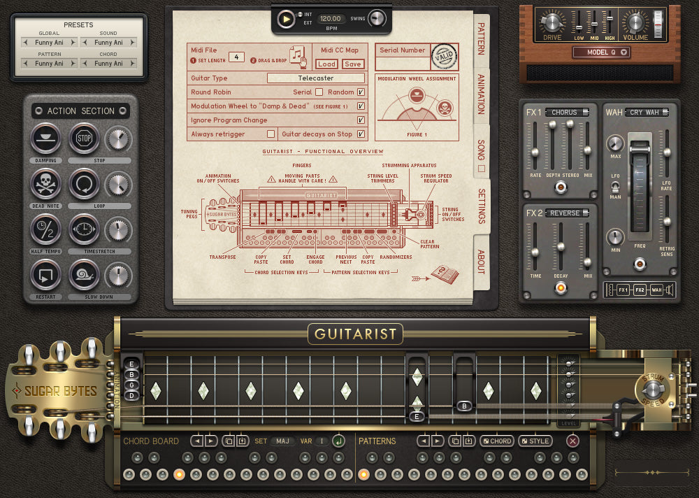 Patterns-sivu keskellä on itse asiassa erittäin helppokäyttöinen. 16 askeleella voit määrittää, laukaiseeko sointu, mitkä kielet soitetaan ja meneekö strum ylöspäin vai alaspäin.