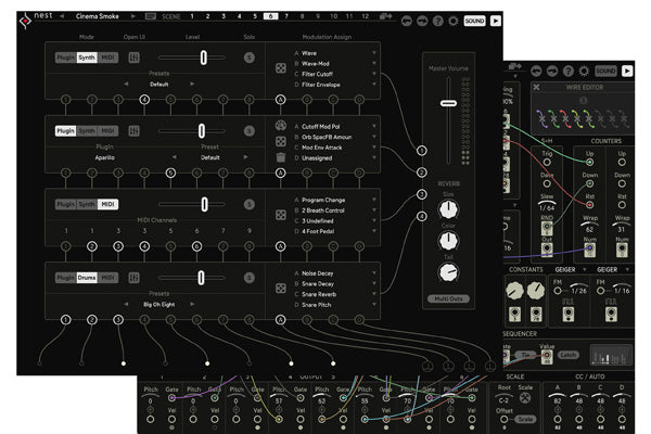 Nest on modulaarinen sekvensseri. Se tarjoaa kaikenlaisia moduuleja laukaisujen ja numeroiden tuottamiseen ja käsittelyyn. Voit rakentaa erittäin monimutkaisia sekvensointiympäristöjä, joiden tavoitteena on tuottaa musiikkia, jolla on oma elämänsä.