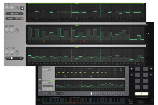 Sävelkaistalla näet Velocity (voimakkuus) ja Gate Sequencer (joka hallitsee kunkin nuotin pituutta). Juuri näissä kolmessa ykkösosassa vietät eniten aikaasi, ohjelmoimalla riffiä ja arpeggioita, ja sitten määrittämällä ne kuvioiksi.
