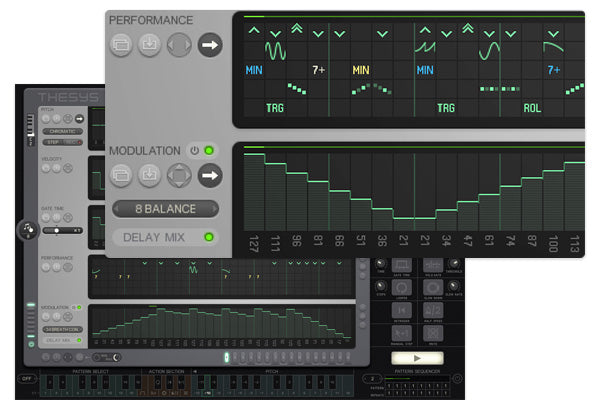 Korkeintaan 16 täyttä kuviota voidaan luoda yhdessä projektissa. Ne voidaan sekvensoida Pattern Sequencerissa (alhaalla oikealla) tai laukaista näppäimistön kautta (asetettuna "Pitch"), jossa koko näppäimistön pituus käytetään nykyisen kuvion transponoimiseen. Vaihda "Performance"-tilaan ja näppäimistö on jaettu kolmeen vyöhykkeeseen: Pattern Select, Action Section ja alue sävelen transponoimiseen.