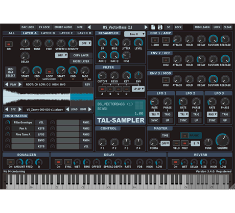 TAL-Sampler ei ole vain näytteen soittaja. Se on täysiverinen analogisesti mallinnettu syntetisaattori, jossa on näytteenottomoottori äänilähteenä, mukaan lukien tehokas modulaatiomatriisi ja korkealaatuiset itse-oskilloivat suodattimet.