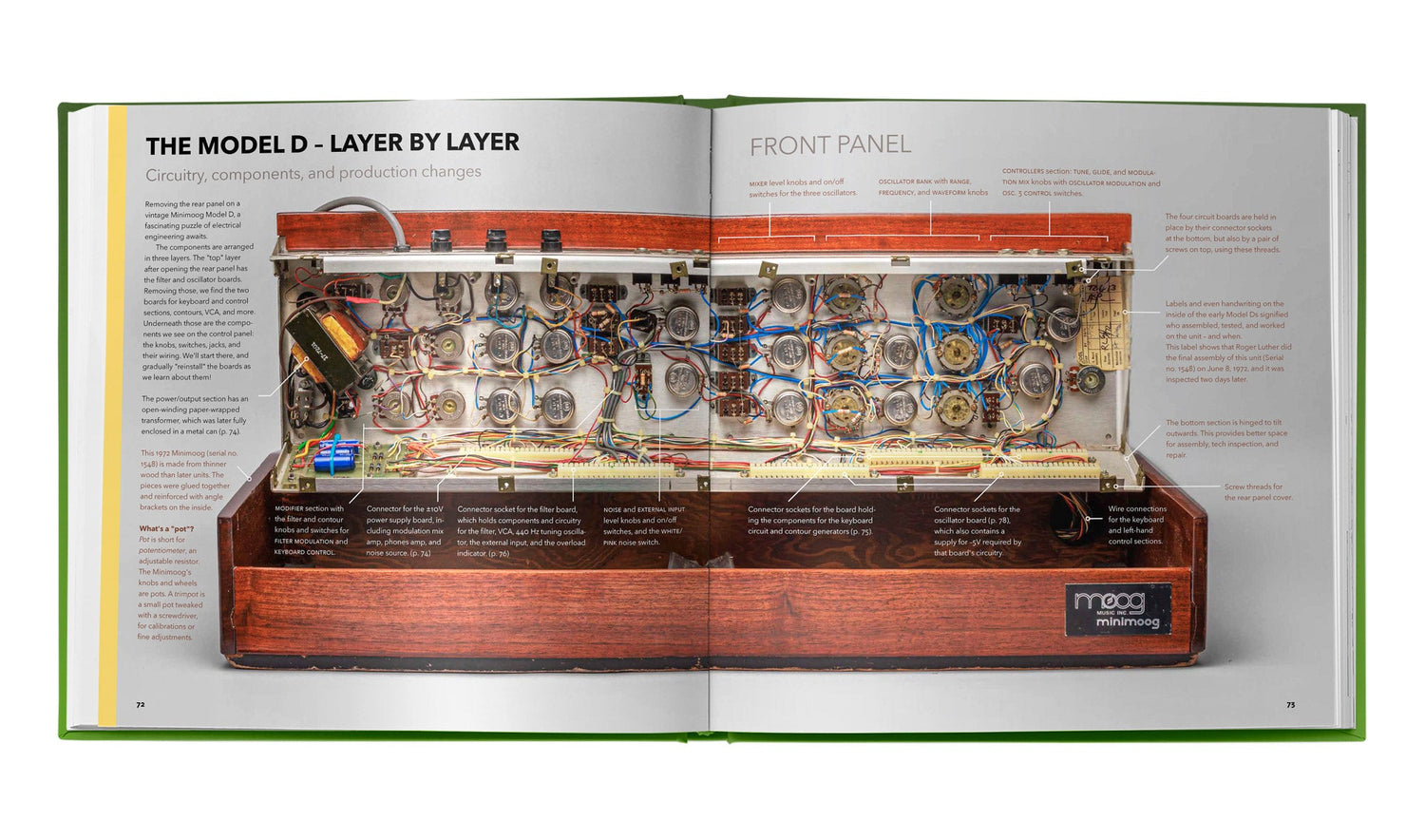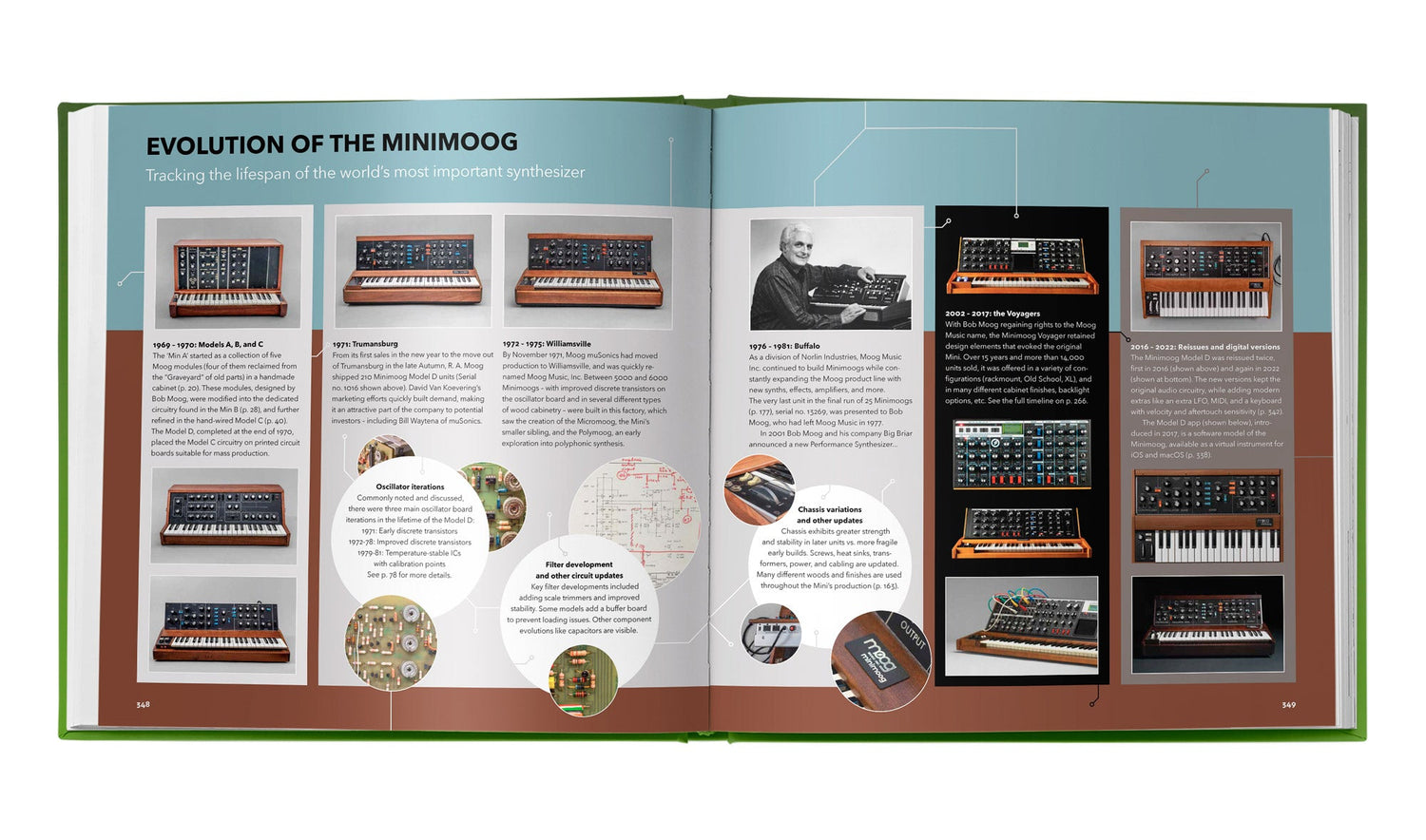 THE MINIMOOG BOOK features exquisite and detailed photography — much of it brand new — as well as schematics, historical promotional materials, engineering interviews, illustrated sound patches, and over 70 artist features. It is the perfect coffee table book and keepsake for lovers of synthesizers, music history, illustration, photography, and timeless books of all kinds.