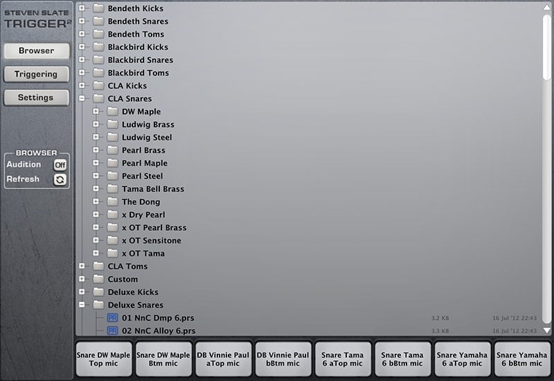 TRIGGER tulee varustettuna teollisuusstandardin rumpunäytteiden kirjastolla, jonka on luonut Steven Slate. Huippumiksaajat, kuten Chris Lord Alge, Ross Hogarth, Justin Neibank, Dave Way, Jeff Juliano, Jay Baumgardner, Ben Grosse, David Kahn, Ryan Williams ja monet muut huippunimet ovat luottaneet Slaten näytteisiin auttaakseen parantamaan rumpuääniä miksauksissaan vuosien ajan. Kaikki Triggerin näytteet on tallennettu 2 tuuman nauhalle ja käsitelty parhailla vintage- ja moderneilla analogilaitteilla. TRIGGER voi myös ladata laajennuskirjastoja, kuten Steven Slate Deluxe, Chris Lord Alge, Terry Date, Blackbird studios ja David Bendeth.