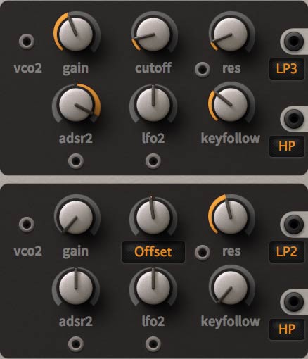 Kuten oskillaattorit, kaksi suodatinta on mallinnettu analogisesta laitteistosta ja tuottavat tyydyttäviä analogisia tuloksia. Voit ylittää suodattimet ilman, että ne tuottavat kovaa vääristymää, ja resonanssi pysyy ehjänä. Tai voit hyödyntää itse-oskillaation ominaisuutta kaoottisten sävyjen ja kokeellisemman äänen suunnittelun saamiseksi.