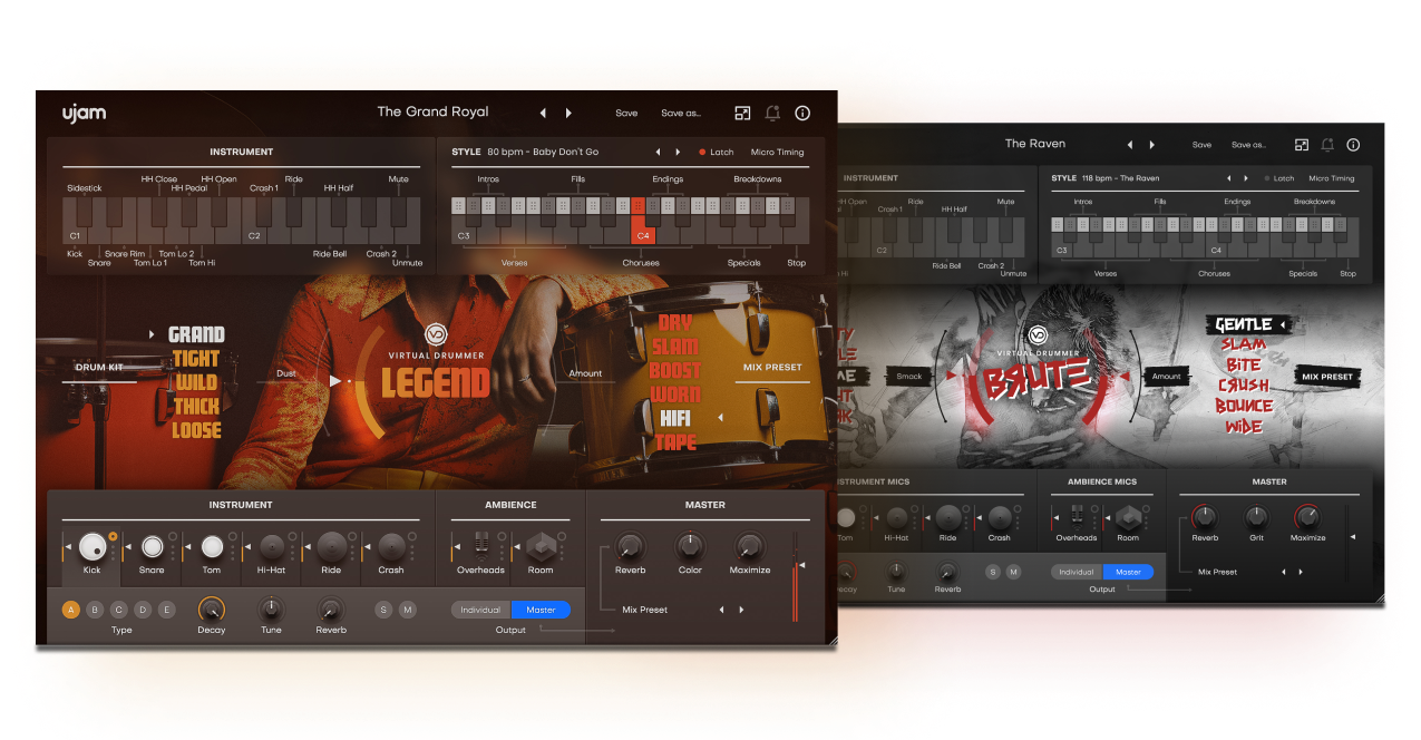 Herätä innostusta Virtual Drummer LEGENDin klassisilla rock-soundeilla tai tuota raskaita rytmejä Virtual Drummer BRUTE:lla. Molemmat tarjoavat aitoja, studio-laatuisia grooveja sekunneissa.