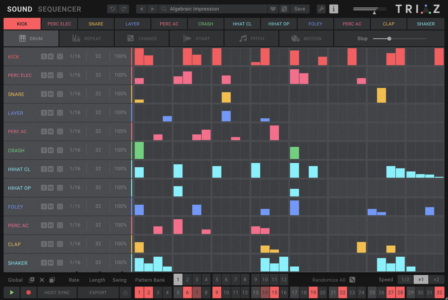 Yksinkertaisista silmukoista villiin polymetriseen tutkimukseen, Triaz antaa sinun rakentaa orgaanisia, dynaamisia, eläviä rytmejä tavoilla, joita mikään perinteinen piano roll ei voi vastata.