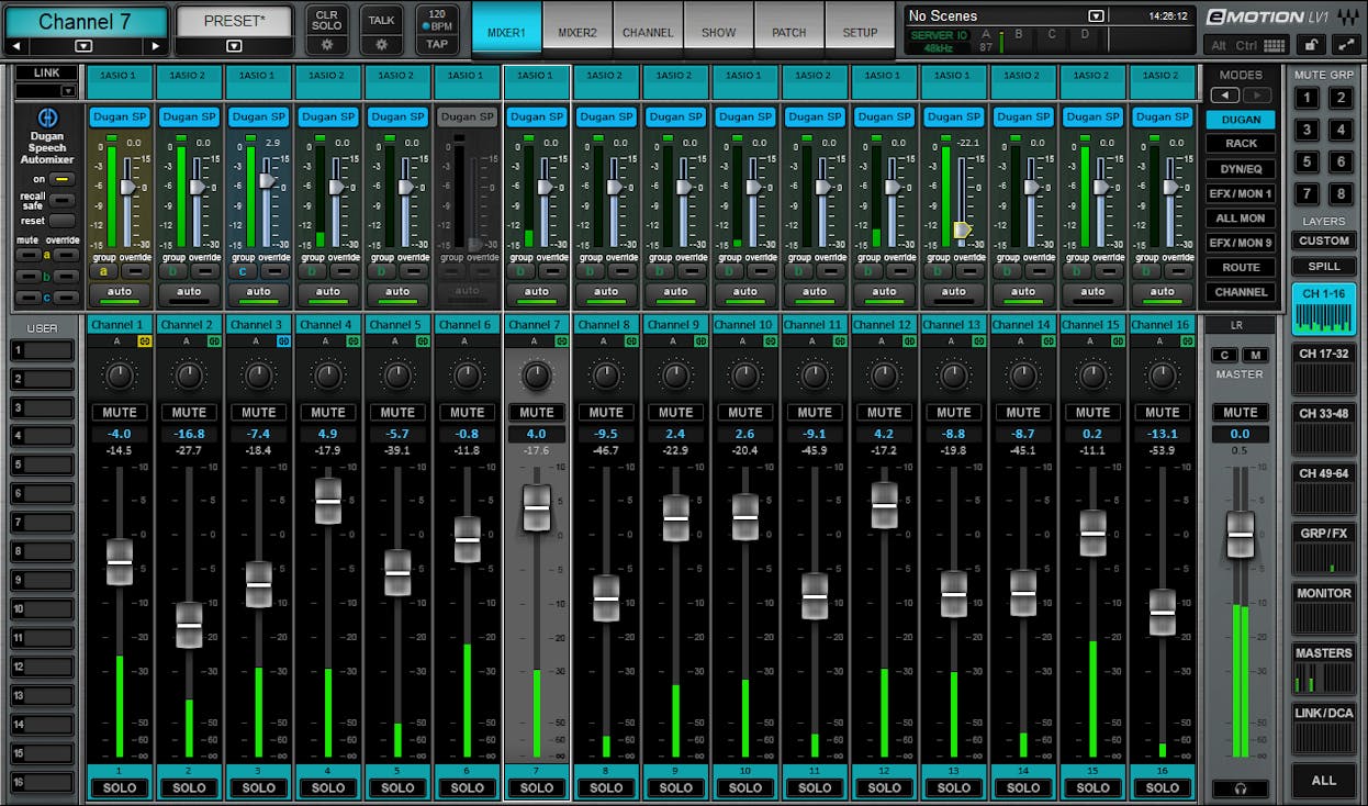 Tässä Dugan Speech -automikseri astuu kuvaan. Äänikeksijä Dan Duganin kanssa kehitetty Dugan Speech hallitsee vahvistusta automaattisesti, reaaliajassa. Unohda useiden mikrofonien hallinnan painajaiset—nyt voit käyttää jopa 64 mikrofonia täydellä luottamuksella.