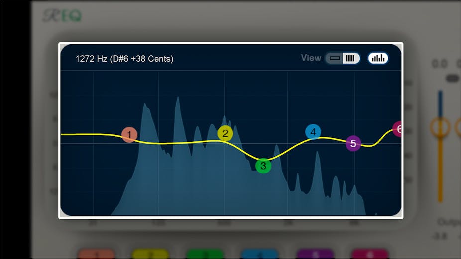 Reaaliaikainen analysoija näyttää tarkalleen, kuinka EQ-säätö vaikuttaa taajuusvasteeseen, mutta siinä on enemmän: vie hiiri näytön päälle, ja näyttö näyttää hiiren osoittimen alla olevan taajuuden sekä hertseinä että musiikillisina nuotteina.