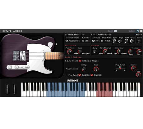 Riko menneisyys - unohda kaikki vanhat, kalliit, kömpelöt näytekirjastot. IronAxen avulla voit rakentaa oman Stratocaster©¹ tai Telecaster©¹ kitarasi, valita mikrofoni-tyypin, määrän ja sijainnin, säätää äänen sävyjä saadaksesi oikean äänen, valita plektran kovuuden tai näppäillä kieltä sormilla sen pituuden missä tahansa kohdassa. Ota lopuksi reaaliaikainen hallinta kaikesta tästä (ja paljon muusta...) käyttäen MIDI-näppäimistöä tai oikeaa - alkuperäisesti tuettua - MIDI-kitaran.