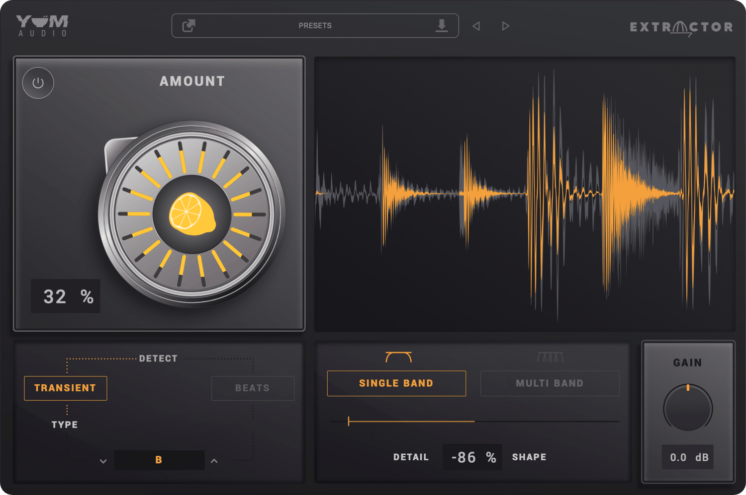 Jokaisessa tilassa voit valita Single ja Multi Band -käsittelyn välillä. Käytä Single Band -käsittelyä korkealle ja välittömälle läpinäkyvyydelle. Käytä Multi Band -vaihtoehtoa lisättyyn älykkääseen taajuuspohjaiseen käsittelyyn, joka eristää lyhyemmän korkean päädyn pitäen pidemmät bassotaajuudet ehjinä.